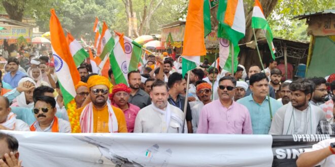 गाजीपुर। भाजपा जखनियां विधानसभा की भारत शौर्य तिरंगा यात्रा मंगलवार को जखनियां तहसील परिसर से निकल कर सैकड़ों कार्यकर्ताओं ने हाथों मे तिरंगा झंडा लेकर भारतीय सैनिकों के सम्मान में नारे लगाते हुए बाजार का भ्रमण किया और महावीर चक्र विजेता शहीद राम उग्रह पांडेय के प्रतिमा पर आकर समाप्त हुआ। इस तिरंगा यात्रा मे शामिल लोगों के मन मे देश भक्ति का जोश और जज्बे का असीम भाव प्रदर्शित हुआ।इस अवसर पर यात्रा में पूर्व जिलाध्यक्ष भानुप्रताप सिंह ,कृष्ण बिहारी राय, बृजेन्द्र राय, अभिनव सिन्हा,रामराज बनवासी, विपिन सिंह, संतोष यादव, धर्मवीर राजभर, संदीप सिंह सोनू, रिपुंजय गुप्ता, दिनेश सिंह, अशोक चौहान, प्रदीप सिंह, अनिल पांडेय, मनोज यादव, प्रशांत सिंह, उमाशंकर यादव, पंकज सिन्हा, अटल सिंह, शिवपूजन चौहान सहित प्रमुख कार्यकर्ता उपस्थित थे । संचालन भाजयुमो प्रदेश उपाध्यक्ष एवं कार्यक्रम संयोजक राजेश राजभर ने किया।