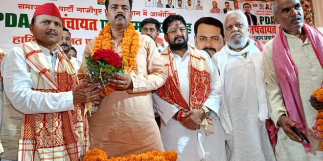 गाजीपुर। समाजवादी पार्टी के तत्वावधान में जिलाध्यक्ष गोपाल यादव की अध्यक्षता में खजुरिया स्थित शहनाई पैलेस में पीडीए जनपंचायत एवं सम्मान समारोह का आयोजन किया गया । कार्यक्रम में इस कार्यक्रम के मुख्य अतिथि आशुतोष सिन्हा जी ने सभी कार्यकर्ताओं को अंगम् वस्त्र प्रदान कर सम्मानित किया।इस अवसर पर सभी नेताओं पदाधिकारियों एवं कार्यकर्ताओं ने मुख्य अतिथि आशुतोष सिन्हा जी को जन्मदिन की बधाई भी दी और उनके दीर्घायु होने की कामना किया। इस पीडीए जनपंचायत को संबोधित करते हुए जिलाध्यक्ष गोपाल यादव ने भाजपा को संविधान , लोकतंत्र सामाजिक न्याय विरोधी बताते हुए कहा कि यह सरकार गरीब ,पिछड़ो ,दलितों की विरोधी है।उन्होंने कहा कि समाजवादी पार्टी जहां समाज के अंतिम पायदान पर खड़े व्यक्ति के चेहरे पर मुस्कराहट लाने को लगातार संघर्ष कर रही है इसके उलट भाजपा चंद औधोगिक घरानों के चेहरे पर मुस्कराहट लाने मे मशगूल है। उन्होंने संविधान और लोकतंत्र पर आसन्न खतरे से आगाह करते हुए कहा कि हमें इनकी साजिश से सचेत रहने की जरूरत है।विधायक जै किशन साहू ने अपने सम्बोधन में कहा कि सरकार मुल्क के धर्मनिरपेक्ष स्वरूप, सामाजिक एवं साम्प्रदायिक सद्भाव और सामाजिक न्याय के लिए खतरा बन गयी है। इसे सत्ता से बेदखल करने की जरूरत है। उन्होंने कहा कि आज प्रदेश में कानून व्यवस्था ध्वस्त है तहसील, थाने, अस्पताल से लेकर सभी क्षेत्रों में भ्रष्टाचार, लूट, पुलिस उत्पीड़न चरम सीमा पर पहुंच गया है जिससे आम व्यक्ति को कहीं भी न्याय नहीं मिल पा रहा है। फरियादी न्याय के लिए दर दर भटक रहे हैं उनकी सुनवाई करने के लिए कोई तैयार नहीं है।आज प्रदेश का नौजवान बेरोजगारी, महंगी शिक्षा ,नौकरियों में भ्रष्टाचार से त्रस्त होकर आत्महत्या करने के लिए मजबूर हो गया है। समाजवादी सरकार में जो विकास कार्यों का कीर्तिमान स्थापित किया गया था, चाहे शिक्षा, स्वास्थ्य, पुलिस सेवा ,इंफ्रास्ट्रक्चर और एक्सप्रेस वे के क्षेत्र में जो कार्य किए गए आज सरकार उसको संरक्षित नहीं कर पाई।इस जनपंचायत के मुख्य अतिथि विधान परिषद सदस्य माननीय आशुतोष सिन्हा ने कहाकि एक तरफ यह सरकार आजादी का अमृत महोत्सव मना रही हैं दूसरी तरफ उत्तर प्रदेश में शिक्षा का कानूनी अधिकार छीना जा रहा है। पीडीए की एकजुटता और बढ़ती ताकत देख भाजपा बौखला गई है। इसके बदले में वह पीडीए तबके के गरीब बच्चों को शिक्षा से वंचित रखने की साज़िश रच रही है। उत्तर प्रदेश में 26हजार 12 प्राथमिक विद्यालय बंद कर दिये गये है,5000प्राथमिक विद्यालयों का विलय किया जा रहा है,दो लाख से ज्यादा शिक्षकों की भर्ती रोकी गयी है। यज्ञ सरकार शिक्षा के मूलभूत ढांचे को नष्ट करना चाहती है । हम सबको सरकार की इस साज