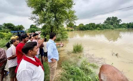 गाजीपुर। मोक्षदायिनी मां गंगा अब विकराल रुप में आ गयी हैं। खतरे के निशान को पार कर अब नये रिकार्ड बनाने को आतुर हैं। पिछले दो-तीन दिनों से अचानक गंगा का जलस्तर तेजी से बढ़ने लगा। तीन अगस्त को दिन में 12 बजे गंगा का जलस्तर 64.040 मीटर तक पहुंच गया है और अभी भी यह बढ़ाव जारी है। जबकि खतरा का निशान 63.105 पर अंकित है। आपदा विशेषज्ञ अशोक कुमार राय ने बताया कि दो सेंटीमीटर प्रति घंटा की रफ्तार से जलस्तर का बढ़ाव जारी है। गंगा के बढ़ने से सैदपुर, करंडा, सदर, जमानियां, भदौरा, रेवतीपुर, मुहम्मदाबाद, भांवरकोल ब्लाक के सैकड़ों गांव प्रभावित हैं। अधिकांश संपर्क मार्गों बाढ़ के पानी से डूब गया है। जिससे ग्रामीणों को आनेजाने में परेशानी हो रही है। जिला प्रशासन और पुलिस प्रशासन बाढ़ से होने वाले परेशानियों से निपटने के लिए हर संभव प्रयास कर रहा है। अधिकांश गांवों में आने-जाने के लिए नाव लगायी गयी हैं। राजस्व के अधिकारी कर्मचारी बाढ़ पर नजर रखे हुए हैं। विधायक मन्नू अंसारी ने बताया कि हमारे विधानसभा के सबसे ज्यादा प्रभावित क्षेत्र रेवतीपुर ब्लाक के हसनपुरा, नगदिलपुर, वीऊपुर, नसीरपुर, भांवरकोल बलाक में फिरोजपुर, जगतपुर, कठार, शेरपुर, सेमरा, चौरासी-पच्चासी, धर्मपुरा, मुहम्मदाबाद में नगवा, नवापुरा, हरिबल्लमपुर आदि हैं। विधायक ने बताया कि हम बाढ़ प्रभावित क्षेत्रों का दौरा कर के पीडि़तों की मदद के लिए हर संभव प्रयास कर रहे हैं।