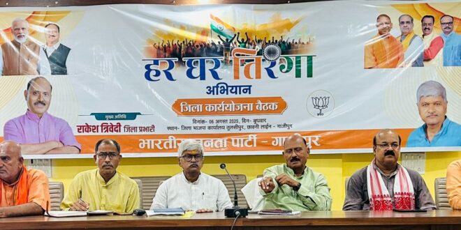 गाजीपुर। भाजपा के आगामी संगठन कार्य योजनाओं के सफल क्रियान्वयन हेतु भाजपा जिला कार्यालय पर “हर घर तिरंगा अभियान”, जिला कार्ययोजना बैठक जिलाध्यक्ष ओमप्रकाश राय की अध्यक्षता में हुई। इस अवसर पर मुख्य अतिथि जिला प्रभारी डा राकेश त्रिवेदी ने बैठक मे अपेक्षितों की उपस्थिती लेकर कहा कि स्वतंत्रता दिवस प्रत्येक भारतीय का पर्व है, प्रधानमंत्री नरेन्द्र मोदी के नेतृत्व में लगातार प्रत्येक वर्ष हर घर तिरंगा अभियान चलाया जा रहा है जिसमें हर भारतीवासी हर्ष उल्लास से अपनी सहभागिता कर रहा है । और कहा की 14 अगस्त 1947 को हमारे अखंड भारत का विभाजन क्यों हुआ?यह किसका कुचक्र इसके इतिहास को समझना हमारे लिए जरूरी है। डा त्रिवेदी ने कहा कि पं नेहरू की पीएम बनने की महत्वाकांक्षा और कांग्रेस की तुष्टिकरण की नीतियां इसके लिए जिम्मेदार है। धन्य है सरदार वल्लभभाई पटेल जिन्होंने देश को अखंड रखने में अपना महत्वपूर्ण योगदान दिया। देश की सभी रियासतों को तत्कालीन गृह मंत्री पटेल के नेतृत्व भारतीय गणतंत्र मे शामिल कर लिया गया ।लेकिन कश्मीर को उलझाए रखने के लिए महत्वाकांक्षी पुरुष पं जवाहर लाल नेहरू ने तुष्टिकरण को अपना कर भारत के लिए कश्मीर को नासूर बना दिया। उन्होंने कहा कि आरएसएस, जनसंघ और भाजपा के दृढ निश्चय ने देश को अखंड भारत का स्वरूप प्रदान किया है। देश प्रधानमंत्री नरेन्द्र मोदी के नेतृत्व मे आत्मनिर्भर बनने की ओर तेज गति से बढ़ रहा है ।आज भारत अर्थ, कृषि, विदेश, रोजगार, शिक्षा सहित विभिन्न क्षेत्रों मे मजबूत हो रहा है।जिलाध्यक्ष ओमप्रकाश राय ने बैठक की प्रस्तावना प्रस्तुति मे कहा भारत के इतिहास में अगस्त महीने का बहुत बड़ा महत्व है।देश और देशवासियों के लिए यह माह बहुत ही महत्वपूर्ण है । जिसमें देश की स्वतंत्रता का असीम सुख और उल्लास है तो वहीं भारत विभाजन जैसी कुछ दुःखद परिस्थितियों की ऐतिहासिक पृष्ठभूमि भी है । उन्होंने कहा कि भारत के स्वाभिमान का प्रतीक तिरंगा हमारे लिए जान से भी ज्यादा किमती है जिसके लिए हमारे पूर्वजों ने लम्बी लड़ाई लड़ी। जिलाध्यक्ष ओमप्रकाश राय ने बताया कि 8 अगस्त को तिरंगा यात्रा के निमित्त सभी मंडलों मे बैठक,10-11-12 अगस्त को मंडलों मे तिरंगा यात्रा,13 अगस्त को मंडल मे शहिदों, स्वतंत्रता संग्राम के सेनानियों का सम्मान तथा उनकी प्रतिमाओ व परिसर की साफ सफाई तथा 14 अगस्त को विभाजन की विभीषिका पर जिलास्तरीय गोष्ठी आयोजित कि जाएगी।जिसकी पुरी तैयारी और जिम्मेदारी बाट दी गई है। उन्होंने कहा कि आगे होने वाले मतदाता पुनर्रीक्षण अभियान में संगठन का पूरा प्रयास होगा कि मतदाता सूची मे सभी पात्र सुचिबद्ध तथा अपात्र बाहर हो।पूर्व जिलाध्यक्ष सुनील कुमार सिंह ने बैठक मे उप