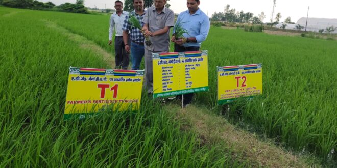 गाजीपुर। कृषि विज्ञान केंद्र आक़ुशपुर गाजीपुर में नैनो डीएपी आधारित प्रदर्शन लगाया गया! यह पारंपरिक दानेदार डीएपी का एक बेहतरीन विकल्प है जिन फसलों में नैनो डीएपी का उपयोग किया जाता है वहां किसान भाई दानेदार डीएपी के उपयोग को आधा कर सकते है! अर्थात खेती की लागत में कमी,नैनो उर्वरकों के प्रयोग से 8 से 12 प्रतिशत तक फसल उत्पादन में बढ़ोत्तरी देखी गई है मतलब कम लागत में अधिक उपज।पर्यावरण प्रदूषण में भी कमी अधिक मात्रा में दानेदार डीएपी यूरिया के प्रयोग से जल,मिट्टी तथा हवा प्रदूषित होती है, दानेदार डीएपी की कीमत 1350 रुपए होती है वहीं एक एकड़ में प्रयोग होने वाली एक बोतल(500 मिली) की बोतल मात्र 600 रुपए में आती है! सारांश- किसान भाइयों की अब लंबी लंबी लाइन में लगकर खाद खरीदने की जरूरत नहीं आधार कार्ड,खतौनी दिखाने की जरूरत नहीं नैनो डीएपी ऐसा विकल्प है जिससे कम लागत में अधिक उपज मिलती है!