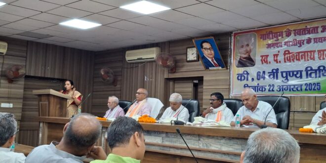 गाजीपुर। पूर्व वर्षों की भांति शुक्रवार को जनपद गाजीपुर के प्रथम राजबन्दी ग्राम रेवतीपुर के मूल निवासी स्व० पं० विश्वनाथ शर्मा की 64 वीं पुण्यतिथि जिला पंचायत सभागार में आयोजित हुयी। इस आयोजन के प्रेरणाश्रोत स्व० विश्वनाथ शर्मा के सुपुत्र स्व० विश्व विमोहन शर्मा थे, जो जनपद गाजीपुर के गांधीयुग के स्वतंत्रता आंदोलन के ख्यातिलब्ध इतिहास ज्ञाता रहे है। यह प्रथम आयोजन था, जिसमें उनका भौतिक योगदान नहीं रहा, परन्तु प्रेरक उपस्थिति हर क्षण मौजूद रही। कार्यक्रम की अध्यक्षता प्रसिद्ध साहित्यकार डा० मान्धाता राय द्वारा की गयी। मुख्य अतिथि श्री पारसनाथ राय एवं संचालन डा० व्यासमुनि राय ने किया। आयोजन के विषय का प्रवर्तन युवा बौद्धिक एवं साहित्यकार माधव कृष्ण ने किया। पारिवारिक मित्र एवं सम्बन्धी कांग्रेस के वरिष्ठ राजनेता श्री रविकान्त राय ने शर्मा जी से प्रेरणा ग्रहण करने हेतु प्रेरित किया। प्रधानाचार्य छविनाथ मिश्र ने समस्त प्रधानाचार्यो की ओर से श्रद्धासुमन अर्पित किया। मा० शिक्षक संघ के प्रान्तीय नेता चौधरी दिनेश चन्द्र राय राजनीति में शुचिता और पवित्रता की बात की। जनपद गाजीपुर के प्रख्यात अर्थशास्त्री श्रीकान्त पाण्डेय ने कहा कि स्व० विश्वनाथ शर्मा गाजीपुर जनपद में गांधी की तरह स्वतंत्रता आन्दोलन के निर्विवादित प्रतीक पुरुष थे। विजय शंकर राय ने शर्मा जी के मूल्यों एवं उसूलों की सराहना की। प्राथमिक शिक्षक संघ के प्रान्तीय नेता दिनेश यादव ने कहा कि शर्मा जी और उनका परिवार आजादी के मूल्यों पर चलने वाला था। आज का दौर अलग है। राधामोहन राय ने जनपद के जिम्मेदार लोगो से शर्मा जी को समर्पित किसी स्मारक की मांग की। नगर पालिका अध्यक्षा सरिता अग्रवाल ने आजादी के आन्दोलन पर प्रकाश डालते हुये इस आन्दोलन में शर्मा जी के योगदान पर चर्चा की। शर्मा जी के परिवार को इस आयोजन के लिए बधाई दी। कांग्रेस पार्टी के जिलाध्यक्ष सुनील राम ने स्वतंत्रता आन्दोलन में गांधी जी के साथ स्व० शर्मा जी की तुलना करते हुए स्व० विश्वनाथ शर्मा को गाजीपुर जनपद का गांधी बताया। भाजपा जिलाध्यक्ष श्री ओम प्रकाश राय ने कहा कि हमें शर्मा जी के नैतिक मूल्यों के के जानकर अपना-अपना मूल्यांकन करना चाहिए। पूर्व भाजपा जिलाध्यक्ष कृष्ण बिहारी राय ने स्वाधीनता संग्राम के भूले बिसरे लोगो को खोजने और सजोने की बात की। मुख्य अतिथि श्री पारसनाथ राय ने कहा कि स्व० शर्मा जी हमारे समय और समाज के लिए आलोक स्तम्भ है, जिनसे हमारा समाज प्रकाशित होता है। अपने अध्यक्षीय उद्बोधन में डा० मान्धता राय ने स्व० शर्मा जी के राजनैतिक, सामाजिक और नैतिक जीवन पर विस्तृत प्रकाश डाला। स्व० शर्मा जी अपवादमस्तक गांधी थे। उन्हों