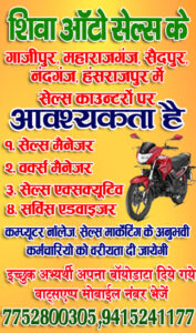 गाजीपुर। भारत की सबसे बड़ी बाइक निर्माता कंपनी हीरो मोटोकार्प लिमिटेड के डीलर शिवा ऑटो सेल्स के गाजीपुर, महाराजगंज, सैदपुर, नंदगंज, हंसराजपुर में सेल्स कांउटरो पर मैनेजर व कर्मचारियो की आवश्यकता है। शिवा ऑटो सेल्स के प्रोपराईटर बबलू सिंह ने बताया कि सेल्स काउंटरो पर सेल्स मैनेजर, वर्क्स मैनेजर, सेल्स एक्सक्यूटिव एवं सर्विस एडवाइजर की आवश्यकता है। कम्प्यूटर नॉलेज व सेल्स मार्केटिंग के अनुभवी अभ्यर्थियो को वरियता दी जायेगी। इच्छुक अभ्र्यथी अपना बॉयोडाटा दिये गये वाट्सएप्प मोबाइल नंबर- 7752800305, 9415241177 पर भेजें।