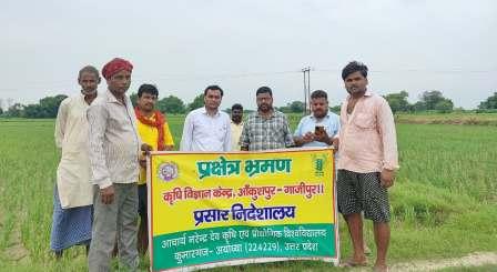 गाजीपुर। धान हमारे देश की प्रमुख खाद्यन्न फसल है और धान की फसल में सबसे अधिक किटों एवं रोगों से नुकसान पहुँचता है। धान में कीटों के प्रकोप से उपज के साथ-साथ गुणवत्ता भी बहुत प्रभावित होती है, जिसके कIरण किसानों को धान की फसल का मनोवांछित मूल्य नहीं मिल पाता और उनको भारी आर्थिक नुकसान का सामना करना पड़ता है , इसको ध्यान में रखते हुए आचार्य नरेंद्र देव कृषि एवं प्रौद्योगिक विश्वविद्यालय कुमारगंज, अयोध्या के अंतर्गत संचालित कृषि विज्ञान केंद्र अंIकुशपुर, गाजीपुर के मृदा वैज्ञानिक डॉ0 दीपक प्रजापति एवं कृषि अभियांत्रिक वैज्ञानिक डॉ0 पंकज कुमार ने प्रक्षेत्र भ्रमण के दौरान किसानो को अवगत कराया कि धान में लगने वाले रोगों के लक्षण एवं कीटो से नुकसान एवं निदान से अवगत कराते हुए बताया जैसे कि पत्ति लपेटक कीट की सुंढ़ी कोमल पत्तियों को किनारे की तरफ से लपेटकर सुरंग बनाकर उसमें अंदर खाती रहती है I फलस्वरूप पौधों की पत्तियों का रंग उड़ जाता है और पत्तियां सूख जाति हैI इसका लक्षण सबसे ज्यादा अगस्त से अक्टूबर माह तक परिलक्षित होता है और इसके नियंत्रण हेतु मोनोक्रोटोफॉस (36 डब्ल्यू ए0सी0 ) 600 मि0ली0 200 से 250 लीटर पानी में घोलकर प्रति एकड़ की दर से छिड़काव करें I क्लोरोपाइरीफॉस 2.5 मि0ली0 प्रति लीटर पानी में मिलकार छिड़काव करना सार्थक होगा I तनाछेदक कीट अपनी सुंढ़यो से नुकसान पहुचाती है तथा यह फूलों के सहद पर निर्वाह करती हैI इसके प्रभाव से पोधे प्रारंभिक अवस्था में ही सूख जाते है और बालियां सफेद दिखाई देने लगती हैं I प्रकाश प्रपंच के प्रयोग से तनIछेदक की संख्या पर नियंत्रण किया जI सकता है I कार्बोफुरान या कारटैप हाइड्रोक्लोराइड 4 जी या फ़िप्रोनिल 0.3 जी 10 से 12 किलोग्राम प्रति एकड़ की दर से प्रयोग करने पर नियंत्रित हो सकता हैं I टिड्डा कीट धान के पत्तों को खाते हैं, ऐसा प्रतीत होता है कि जैसे जानवरों ने चरा हो, इसके नियंत्रण हेतु गर्मी के समय धान के खेतों के मेढ़ो क़ी खुरचाई करने से इनके अण्डे नस्ट हों जाते हैं और इनकी संख्या कम होने लगती है I इसके रोगथाम के लिए क्लोरोपाइरीफॉस 20 ई0सी0 या क्विनोलफॉस 25 ई0सी0 2.5 मि0ली0 प्रति लीटर की दर से छिड़काव करे I कार्बारिल या मिथाइलपैराथियान पाउडर 10 से 12 किलोग्राम प्रति एकड़ की दर से बुरकाव करने से धान की फसल सुरक्षित हो जाती है I धान में खैरा रोग जिंक तत्व की कमी से होता है I पत्तियां पहले नीचे से पीली होने लगती है नई पत्तियों पर भूरे रंग के धब्बे और धारियां विकसित हो जाती है, जो पुरानी पत्तियों को पूरी तरह से ढक लेती हैं और उत्पादन में 25% की कमी के साथ-साथ लक्षण दो तीन सप्ताह बाद परिलक्षित होता है I इसकी रोकथाम हेतु जिंक सल्फेट 10 से 12 किलोग्राम प्रति एकड़ मिट्टी में रोपाई /बुवाई के पू