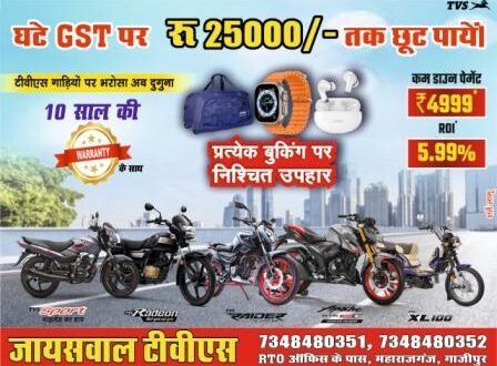 गाजीपुर। भारत के प्रसिद्ध बाइक निर्माता कंपनी टीवीएस के डीलर जायसवाल TVS के एमडी सुभीत जायसवाल ने बताया कि TVS की गाड़ियां अपने दमदार इंजन, मजबूत बॉडी और अत्याधुनिक टेक्नोलॉजी के लिए जानी जाती हैं। कंपनी को लगातार पिछले पांच सालों से JD Power द्वारा टू-व्हीलर सेगमेंट में नंबर वन क्वालिटी का अवॉर्ड मिल रहा है। उन्होने बताया कि घटे GST पर ₹25,000/- तक की बचत, साथ ही बंपर ऑफ़र्स, इस त्योहारी सीजन जायसवाल TVS लेकर आया है आपके लिए सबसे बड़ा फायदा, अब पाएं घटे हुए GST पर ₹25,000/- तक की छूट, साथ ही ढेरों उपहार और ऑफ़र्स हैं। इसके साथ ही मात्र ₹4,999 /- डाउन पेमेंट, ब्याज दर सिर्फ 5.99%, हर बुकिंग पर पक्का गिफ़्ट (डफल बैग / OPPO स्मार्ट वॉच / ईयरबड), TVS iQube इलेक्ट्रिक पर ₹3,500 कैश बैक, पुरानी गाड़ी एक्सचेंज पर सबसे बेहतर प्राइस उपलब्ध है। ग्राहकों के भरोसे को और मजबूत करते हुए TVS की सभी गाड़ियों पर अब 10 साल तक की वारंटी उपलब्ध है। इसका मतलब है कि अगले 10 साल तक किसी भी बड़े खर्च से ग्राहक पूरी तरह मुक्त रहेंगे। 22 सितंबर को भारी भीड़ की संभावना को देखते हुए एडवांस बुकिंग पर ग्राहकों को प्रायोरिटी गिफ़्ट (डफल बैग / OPPO स्मार्ट वॉच / ईयरबड) दिया जाएगा। इसके अलावा चुनिंदा मॉडलों पर ₹2,500 से ₹15,000 तक नकद छूट भी उपलब्ध है। अधिक जानकारी के लिए जायसवाल TVS , RTO ऑफिस के पास, महाराजगंज, गाज़ीपुर 7348480351, 7348480352 संपर्क करें। मालगोदाम रोड, गाज़ीपुर 9454600925, 9305677280 पर संपर्क करें।
