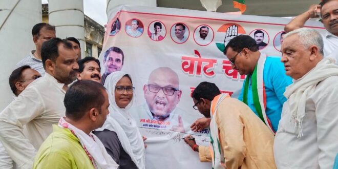 गाजीपुर! जिला एवं शहर कांग्रेस कमेटी ने संयुक्त रूप से भाजपा और चुनाव आयोग के खिलाफ “वोट चोर, गद्दी छोड़” नारा बुलंद करते हुए कचहरी स्थित कामरेड सरजू पांडे पार्क में एक धरना – प्रदर्शन आयोजित किया। इसकी अगुवाई प्रदेश सचिव फसाहत हुसैन बाबू ने किया और अध्यक्षता जिलाध्यक्ष सुनील राम ने किया साथ ही इस अवसर पर जिला एवं शहर कांग्रेस कमेटी के पदाधिकारी एवं सदस्य बड़ी संख्या में मौजूद रहे। इस अवसर पर कांग्रेस पार्टी के प्रदेश सचिव और गाजीपुर के प्रभारी फसाहत हुसैन “बाबू” ने भाजपा और चुनाव आयोग पर मिलीभगत का आरोप लगाते हुए कहा कि ये संस्थाएं स्वतंत्र और निष्पक्ष चुनावों को कमजोर कर रही है। उन्होंने बताया कि हमारे नेता और सांसद राहुल गांधी के साथ कांग्रेस पार्टी ने इस मुद्दे को संसद के अंदर और बाहर लगातार उठाया है और “वोट चोरी” का पर्दाफाश किया है। उन्होंने बताया कि अखिल भारतीय कांग्रेस कमेटी ने वोट चोरी के खिलाफ 5 करोड़ हस्ताक्षर एकत्र करने के लिए एक समन्वित अभियान चलाया है, जिसके तहत हर बूथ स्तर पर ये अभियान चलाया जा रहा है। जिसमें गाजीपुर में ये अभियान जोर शोर से चल रहा है।जिलाध्यक्ष सुनील राम ने कहा कि भाजपा सरकार बड़े पैमाने पर वोट चोरी कर रही है और हमारे नेता राहुल गांधी इस मुद्दे को जोर शोर से उठा रहे है, और उनके समर्थन में हमने इन कार्यक्रमों को सफलतापूर्वक आयोजित करने के लिए तैयारियां शुरू कर दी हैं। शहर अध्यक्ष संदीप विश्वकर्मा ने कहा कि शहर कांग्रेस कमेटी के नेता और कार्यकर्ता इन कार्यक्रमों में सक्रिय भागीदारी करते हुए नगर के पच्चीसों वार्ड में वोट चोरी के खिलाफ आम जनता के बीच हस्ताक्षर अभियान चला रहे है।पूर्व विधायक अमिताभ अनिल दुबे एवं एआईसीसी सदस्य रविकांत राय ने संयुक्त रूप से कहा कि यह अभियान संविधान की रक्षा और भारतीय लोकतंत्र को सुरक्षित रखने की निर्णायक पहल है। हम लोग इस कार्य को एकजुटता और दृढ़ निश्चय के साथ इस कार्य को कर रहे हैं, ताकि इसकी गूंज पूरे देश में सुनाई दे। कार्यक्रम का संचालन शहर अध्यक्ष संदीप विश्वकर्मा ने किया, इस दौरान सैकड़ों की भीड़ उपस्थित रही।इस अवसर पर प्रमुख रूप से प्रमुख रूप से वरिष्ठ कांग्रेस नेता अजय सिंह अरविंद मिश्रा पीसीसी सदस्य अजय श्रीवास्तव ज्ञान प्रकाश सिंह चंद्रिका सिंह राजीव सिंह विद्याधर पांडे मंसूर जैदी राजेश गुप्ता सदानंद गुप्ता आशुतोष गुप्ता महबूब निशा राम नगीना पांडे सतीश उपाध्याय लाल मोहम्मद अखिलेश यादव आशुतोष गुप्ता राम करुणानिधि राय ओम प्रकाश यादव रईस अहमद मुनीर जाफरी सुमन चौबे किरण गौतम राजेश उपाध्याय अयूब अयूब राघवेंद्र राजेश अवधेश भारती संजय सिंह देवेंद्र सिंह आशुतोष सिन्हा विनोद सिंह इरफान खान 