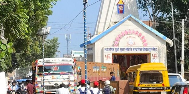 ग़ाज़ीपुर। प्रशासन ने नवरात्र को देखते हुए 22 सितंबर से 5 अक्टूबर तक सुगम यातायात व्यवस्था संचालन हेतु भारी वाहनों का डायवर्जन किया गया है।लेकिन करंडा से आने वाले भारी वाहन नंदगंज के चोचकपुर मोड़ से धड़ल्ले से जा रहे है जिससे आने जाने वाले लोगों को परेशानी का सामना करना पड़ रहा है।जबकि नंदगंज के चोचकपुर मोड़ से सट कर हर साल के भांति इस साल भी मां दुर्गा जी का पंडाल बना कर मूर्ति स्थापित की गई है। सपा सदर विधान सभा के सचिव अमन जायसवाल ने बताया कि करंडा से आने वाले भारी वाहनों को चोचकपुर से सैदपुर होते हुए गंतव्य स्थान पर जाना है लेकिन भारी वाहन चोचकपुर से नंदगंज से जा रहे है जिससे नवरात्र में बाजार में भीड़ होने और उस पर से भारी वाहनों के आ जाने से जाम लग जा रहा है।श्री जायसवाल ने बताया कि भारी वाहनों के चालक प्रशासन द्वारा बनाए गए डायवर्जन के नियम का पालन नहीं कर रहे है। श्री जायसवाल ने जिला प्रशासन से मांग किया है कि नंदगंज के चोचकपुर मोड़ से भारी वाहनों पर रोक लगाया जाय।