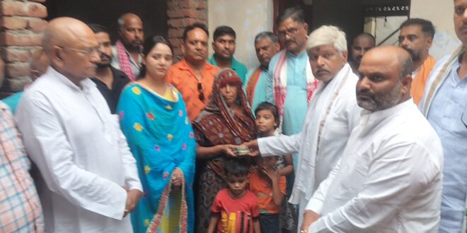 गाजीपुर। भाजपा जिलाध्यक्ष ओमप्रकाश राय के साथ भाजपा पदाधिकारियों ने आज जमानिया विधानसभा के करहिया बूथ संख्या -368 के बूथ अध्यक्ष स्व राकेश सिंह के घर भदौरा मंडल के ग्राम – करहिया पहुंच कर उनको श्रद्धांजलि अर्पित किया तथा उनके एकलौते तीन वर्षीय पुत्र श्रवण कुमार,पांच और सात वर्ष की दो पुत्रियों सुप्रिया,शुभांगी, पत्नी शशि सिंह तथा वृद्ध मां विन्ध्याचली देवी को जिलाध्यक्ष ओमप्रकाश राय ने आर्थिक मदद के रूप में 150000 की धनराशि देकर परिवार की हर परिस्थितियों में सहायता करने का भाव प्रकट किया और कहा कि भाजपा का देवतुल्य कार्यकर्ता संगठन की सेवा निष्ठा और ईमानदारी से करता है इस कारण उसका जीवन संघर्षशील होता है और आज हम ऐसे ही अपने संघर्षशील और जुझारू बूथ अध्यक्ष के आकस्मिक असामयिक निधन पर अपनी श्रद्धांजलि अर्पित करते हैं । 34 वर्षिय भाजपा बुथ अध्यक्ष राकेश राय का निधन 18 सितम्बर को विद्युत स्पर्शाघात से हो गया था ।जबकि इनके पिता योगेन्द्र सिंह का निधन भी इसी अवस्था मे 30-31 वर्ष पूर्व करंट लगने से ही हुई। इस अवसर पर जिला पंचायत अध्यक्ष सपना सिंह, पूर्व जिलाध्यक्ष भानुप्रताप सिंह महामंत्री प्रवीण सिंह, दयाशंकर पांडेय पारस नाथ राय, जिला मीडिया प्रभारी शशिकांत शर्मा, अच्छेलाल गुप्ता, विष्णु प्रताप सिंह, मनोज सिंह, आशुतोष चौबे, जितेन्द्र उपाध्याय, संजय सिंह, विकास सिंह राकेश राय, पप्पू चौबे, भक्ति सिंह और सत्यजीत सिंह के आलावा स्थानिय भाजपा कार्यकर्ता उपस्थित थे।