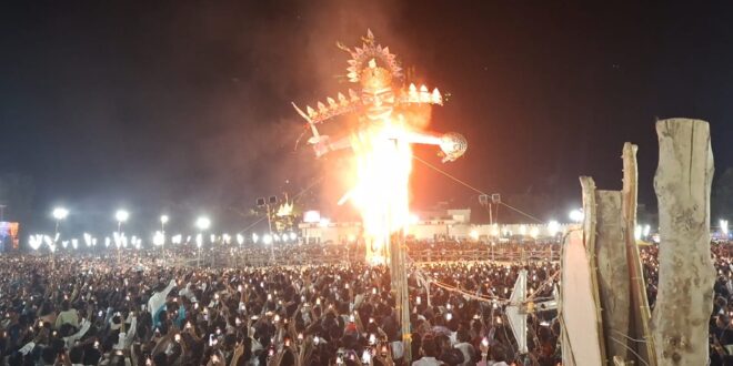 गाजीपुर। अति प्राचीन श्री रामलीला कमेटी हरि शंकरी की ओर से लीला16 में दिन 2 अक्टूबर दिन बृहस्पतिवार को रामलीला मैदान लंका में प्रतिवर्ष के भांति इस वर्ष रावण वध विजयदशमी का मंचन किया गया। राम रावण युद्ध में प्रभु श्री राम के द्वारा रावण का वध का मंचन किया गया। इस दौरान कमेटी के संरक्षक एवं जिलाधिकारी अविनाश कुमार एवं कमेटी के सह संरक्षक तथा पुलिस अधीक्षक डॉक्टर ईरज राजा की मौजूद रहे। जिलाधिकारी और एसपी द्वारा सँयुक्त रूप से बटन दबाकर रावण के पुतले का दहन किया गया। मालूम हो कि मेघनाथ कुंभकरण के मारे जाने के बाद लंका नरेश महाराज रावण क्रोधित होकर राम से युद्ध करने चतुरंगिणी सेवा के साथ चल देता है। युद्धभूमि में पहुंचकर राम लक्ष्मण को ललकारता है उसकी ललकार सुनकर श्री राम लक्ष्मण महाराज रावणको बहुत प्रकार से समझते हैं कहते हैं कि है रावण मैं आपको अंतिम चेतावनी देता हूं कि सीता को आदर पूर्वक मेरे हवाले कर दो और कुशलपूर्वक आप अपने लंका वासियो के साथ अपने राज्य में निवास करो लेकिन राम के बाद को अनसुनी करके रावण कहता है कि अगर आप क्षत्रिय वंशज के हो तो आप हमसे युद्ध करो और अपनी पत्नी सीता को लंका से ले जाओ। रावण के बात को सुनकर राम लक्ष्मण अपनी बानरी सेना ओ के साथ युद्ध भूमि में आते हैं। दोनों दलों में घमासान युद्ध शुरू हो जाता है। श्री राम ने रावण को करने के लिए बाणों की वर्षा शुरू कर देते हैं फिर भी रावण के ऊपर बालों का कोई असर नहीं होता है अंत में रावण के छोटे भाई विभीषण ने श्री राम के कानों के आकर पास आकर श्री राम से कहते हैं की प्रभु लंका नरेश महाराज रावण के नाभि में अमृत है अतः आप आप अग्निबाण प्रयोग करें। विभिषण की बात को सुनकर श्री राम ने अग्निबाण का अनुसंधान करके रावण के ऊपर चलाया। अग्निबाण नाभि में लगते ही रावण ही राम कहके धराशाई हो जाता है। उसके दर्शन होने के बाद श्री राम ने अपने छोटे भाई लक्ष्मण को बुलाकर के कहते हैं कि है लक्ष्मण रावण शिव भक्त और प्रकांड विद्वान राजनीतिज्ञ हैं। अतः तुम उसके पास जाकर राजनीतिक विद्या सीखो अपने बड़े भाई श्री राम की बात को सुनकर लक्ष्मण जी महाराज रावण के पास जाकर उसके सिरके पास खड़े हो जाते हैं जिससे वह लक्ष्मण को नहीं देख सका लक्ष्मण जी वापस बड़े भाई श्री राम के पास आकर के कहते हैं कि महाराज रावण ने मुझे कुछ भी नहीं बताया। लक्ष्मण के बात को सुनकर श्री राम उनसे पूछते हैं कि आप महाराज रावण के पास गए थे वहां जाकर किधर खड़े थे तब लक्ष्मण ने श्री राम से कहा कि भैया मैं तो रावण के सिर के पास खड़ा था। लक्ष्मण की बात को सुनकर राम लक्ष्मण को लेकर महाराज रावण के पास जाते हैं और शिव भक्त महाराज रावण को हाथ जोड़कर प्रणाम करते हैं। रावण ने श्री राम लक्ष्मण को दि