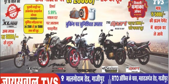 गाजीपुर। हिदुस्तान की प्रसिद्ध बाइक निर्माता कंपनी टीवीएस के डीलर जायसवाल टीवीएस ने गाजीपुरवासियों के लिए दीपावली, डाला छठ के पावन पर्व पर दिवाली धमाका स्कीम का ऐलान किया है। टीवीएस जायसवाल के प्रोपराइटर सुमित जायसवाल ने पूर्वांचल न्यूज डाट काम को बताया कि इस दीपावली पर जायसवाल TVS लेकर आया है ग्राहकों के लिए सबसे बड़ा तोहफ़ा! अब TVS मोटर के सभी मॉडलों पर मिल रहा है घटे हुए GST का लाभ और बंपर ऑफ़र्स, जिससे दोपहिया वाहन खरीदना पहले से कहीं अधिक आसान और फ़ायदेमंद हो गया है।