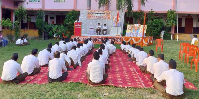 गाजीपुर राष्ट्रीय स्वयंसेवक संघ के 100 वर्ष पूरे होने के उपलक्ष में संपूर्ण देश की बात जनपद गाजीपुर की माधव बस्ती में भी संघ स्थापना एवं विद्यादानी उत्सव मनाया गया इस अवसर पर राष्ट्रीय स्वयंसेवक संघ की माधव व्यक्ति के स्वयंसेवकों ने पूर्ण गणेश में पत्र संचालन भी किया इस कार्यक्रम की अध्यक्षता स्नातकोत्तर महाविद्यालय गाजीपुर के शिक्षा संकाय के विभाग अध्यक्ष डॉक्टर यस डी परिहार ने किया था कार्यक्रम के मुख्य अतिथि राष्ट्रीय स्वयंसेवक संघ के जिला प्रचारक प्रभात जी थे कार्यक्रम का प्रारंभ मंचासीन अधिकारियों द्वारा भगवान श्री राम तथा भारत माता के चित्र पर पुष्प अर्पण एवं शस्त्र पूजन के साथ हुआ इस अवसर पर राष्ट्रीय स्वयंसेवक संघ के जिला प्रचारक प्रभात जी ने संघ के स्वयंसेवकों को संबोधित करते हुए कहा कि अपने 100 वर्ष की यात्रा में संघ के स्वयंसेवकों ने कठिन परिश्रम करके राष्ट्रीय स्वयंसेवक संघ को विश्व का सर्वश्रेष्ठ एवं सबसे बड़ा संगठन बनाया है इस कार्य में संघ की तीन पीढियां ने आत्मा हुती दी है व्यक्ति से समष्टि समष्टि से संस्कार वान व्यक्ति तथा संस्कारवान व्यक्ति से संस्कारवान परिवार संस्कारवान परिवार से संस्कार पूर्ण समाज तथा संस्कार युक्त समाज से सर्व प्रभुत्व संपन्न राष्ट्र की स्थापना ही राष्ट्रीय स्वयंसेवक संघ का उद्देश्य है पिछले 100 वर्षों से संघ की स्वयंसेवक इसी उद्देश्य लक्ष्य की प्राप्ति के लिए कार्य करते चले आ रहे हैं और संघ के स्वयंसेवकों ने समाज के हर क्षेत्र में जाकर कार्य करते हुए विश्व के बड़े संगठन का निर्माण किया शिक्षा के क्षेत्र में विद्या भारती मजदूरों के क्षेत्र में भारतीय मजदूर संघ विद्यार्थियों के क्षेत्र में अखिल भारतीय विद्यार्थी परिषद धर्म के क्षेत्र में विश्व हिंदू परिषद आदि लगभग विश्व में 40 संगठनों का कार्य राष्ट्रीय स्वयंसेवक संघ के माध्यम से चल रहा है कार्यक्रम की अध्यक्षता कर रहे डॉक्टर परिहार ने कहा कि संघ की स्थापना के समय ही संघ के संस्थापक पूज्य डॉक्टर जी ने कहा था कि हम कोई नया कार्य नहीं कर रहे हैं केवल पद्धति एवं तंत्र नया है समय-समय पर जब भी इस राष्ट्र की संस्कृति एवं मूल्य पर संकट आए हैं शिवाजी और विवेकानंद जैसे महापुरुषों ने रचनात्मक कार्य किया है यदा यदा ही धर्मस्य ग्लानिर्भवति भारत अभ्युक्ति थाना धर्मस्य तालाब में नियम सजा में हम के कार्य को आगे बढ़ते हुए कलयुग में पूज्य डॉक्टर साहब ने राष्ट्रीय स्वयंसेवक संघ की स्थापना करके राष्ट्र और विश्व के कल्याण के लिए जो कार्य किया है उसके परिणाम आज दिखाई दे रहे हैं अयोध्या में 500 वर्षों की कठिन परिश्रम के बाद भगवान श्री राम के मंदिर का निर्माण तथा कश्मीर से धारा 370 का हटाया 