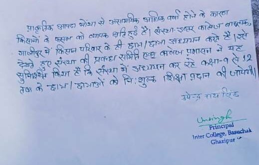 ग़ाज़ीपुर।प्राकृतिक आपदा और असामयिक वर्षा से किसानों की फसलें बर्बाद हो जाने के कारण इंटर कॉलेज बासूचक की प्रबंध समिति ने एक मानवीय निर्णय लिया है। समिति ने तय किया है कि किसान परिवारों की आर्थिक स्थिति को देखते हुए विद्यालय में कक्षा 9 से 12 तक अध्ययनरत सभी छात्र-छात्राओं को निःशुल्क शिक्षा प्रदान की जाएगी। विद्यालय प्रशासन ने बताया कि क्षेत्र के अधिकांश छात्र-छात्राएँ किसान परिवारों से संबंध रखते हैं और इस वर्ष की विपरीत मौसमीय परिस्थितियों ने उनकी आजीविका पर गहरा असर डाला है। ऐसे में यह कदम विद्यार्थियों के शैक्षणिक भविष्य को सुरक्षित रखने की दिशा में एक सकारात्मक प्रयास है।इस निर्णय की जानकारी विद्यालय के प्रधानाचार्य उपेंद्र नाथ सिंह ने एक प्रेस विज्ञप्ति के माध्यम से दी। उन्होंने बताया कि प्रबंध समिति का यह निर्णय किसानों के हित में उठाया गया है और इसका लाभ विद्यालय के सभी पात्र विद्यार्थियों को मिलेगा।