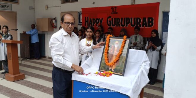गाजीपुर। शाह फ़ैज़ पब्लिक स्कूल गाजीपुर में गुरु नानक जयंती को हर्षोल्लास के साथ मनाया गया। कार्यक्रम की शुरुआत प्रार्थना सभा से किया गया। विद्यालय के निदेशक डॉ नदीम अदहमी ने गुरु नानक जी के चित्र पर माल्यार्पण करने के बाद उनके जीवन पर प्रकाश डालते हुए उनके तीन मूल सिद्धांत- असहायों की मदद करना, आपसी भाईचारा और ईश्वर पर विश्वास को स्पष्ट करते हुए बताया कि ये सिद्धांत जीवन में बहुत उपयोगी होते हैं।। छात्र-छात्राओं ने गुरु नानक जी की वंदना किया तथा उनके आदर्शों एवं कृत्यों पर अपने विचारों को व्यक्त किया। उक्त अवसर पर विद्यालय के निदेशक डॉ नदीम अदहमी, प्रधानाचार्य इकरामुल हक, उपप्रधानाचार्य हनीफ अहमद, शिक्षक शिक्षिकाएं एवं छात्र-छात्राएं उपस्थित रहे।