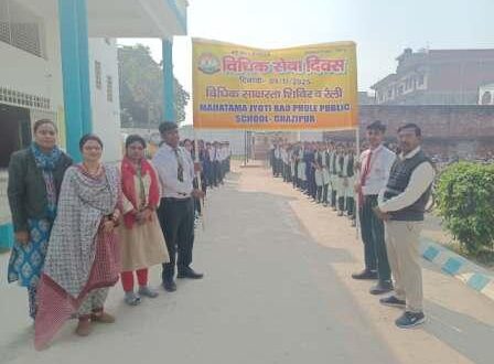 गाजीपुर। उ0प्र0 राज्य विधिक सेवा प्राधिकरण लखनऊ एवं जिला सेवा प्राधिकरण के निर्देशानुसार एम0जे0आर0पी0 पब्लिक स्कूल जगदीशपुरम गाजीपुर में दिनांक 09/11/2025 को विधिक सेवा दिवस मनाया गया जिसमें विद्यालय के सभी शिक्षकगण, कर्मचारियों एवं छात्र-छात्राओं को न्यायपालिक के बारे में जागरूक किया गया एवं न्यायपालिका का महत्व समझाया गया। इस अवसर पर विधिक सेवा शिविर का भी आयोजन किया गया एवं विधिक सेवा रैली भी निकाली गयी जिसके माध्यम से छात्र-छात्राओं को विधिक सेवा दिवस का महत्व समझाते हुए अन्य जानकारियां प्रदान की गयीं। इस अवसर पर विद्यालय के प्रधानाचार्य सुदर्शन सिंह कुशवाहा, उप-प्रधानाचार्य राकेश पाण्डेय, हरि कुशवाहा, राज नारायण कुशवाहा, सरस्वती सिंह, दिनकर सिंह, संजीव अग्रहरी, दीपक कुमार एवं समस्त शिक्षक गण व छात्र उपस्थित रहे।