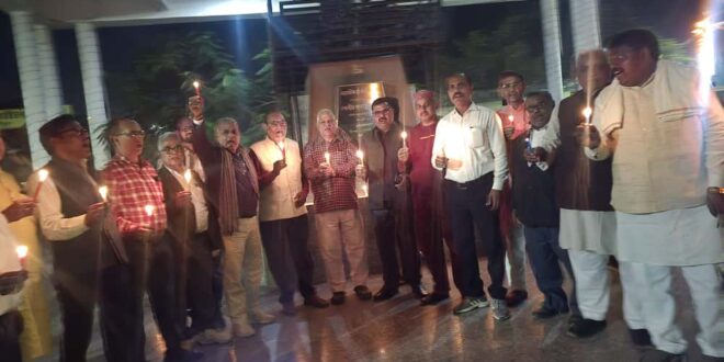 गाजीपुर। दिल्ली के लाल किले के पास 10 नवम्बर को हुए बम ब्लास्ट मामले मे मारे गये 12 निर्दोष लोगो के दोषी आतंकवादियो के खिलाफ विरोध प्रदर्शन करते हुए उ.प्र. अधिवक्ता परिषद गाजीपुर के तत्वाधान मे कैन्डिल जलाकर विरोध प्रदर्शन बुधवार को जिला मुख्यालय स्थित सरयू पाण्डेय पार्क में किया गया। इस कार्यक्रम में सभी आमजन व नागरिको ने इस घटना की घोर निन्दा करते हुए मारे गये सभी लोगो के प्रति संवेदना प्रकट किया और इस जेहादी आतंकवाद कांे जड़ से समाप्त करने का संकल्प लिया। इस अवसर पर अधिवक्ता परिषद के अध्यक्ष सुधाकर राय ने बताया कि 10 नवम्बर को हुए जेहादी आतंकवाद का हम घोर निन्दा करते है दिल्ली के लाल किले के पास हुए इस कार बम ब्लास्ट मे मारे गये सभी लोगो की आत्मा की शान्ति के लिए आज जिला मुख्यालय स्थित सरयू पाण्डेय पार्क मे श्रद्धांजलि सभा कर आक्रोश व्यक्त किया। इस घटना के दोषी जेहादी डाक्टरो का हम विरोध करते है और इस आतंकवादी घटना को लेकर हम देशवासियो मे एक आक्रोष पनप रहा है। इस बीच पाकिस्तान मुर्दाबाद व जेहादी डाक्टर मुर्दाबाद के नारे से पूरा परिसर गुंज उठा। इसी क्रम मंे राजकुमार सिंह ने बताया की समय रहते इन जेहादी डाक्टरो का इलाज नही किया गया तो ये हमारे लिए नाशुर बन जायेगे ऐसे जेहादी डाक्टरो का विरोध कर इन्हे फांसी की सजा दिया जाना चाहिए और इसके जन्मदाता पाकिस्तान को सबक सिखाने की जरूरत है। इस पर जिला पंचायत सदस्य शैलेष राम ने बताया कि हम भारत देश के नागरिको मे इस घटना से सभी लोगो मे आक्रोष है सभी देशवासियो का खुन खौल उठा है, इस घटना के जिम्मेदार जेहादी डाक्टरो की फौज को जड़ से उखाड़ फेकेने का आहवाहन किया। कार्यक्रम मे कृपाशंकर राय ने बताया कि हम देश के लोगो के साथ इस तरह की घटना पर सख्त कार्यवाही करते हुए न्यायालय से अनुरोध करते है कि इस घटना मे शामिल आतंकवादियो को शीघ्र फांसी देकर देश की जनता के साथ न्याय करने की अपील की है और इस घटना मे मारे गये देशवासियो को प्रति यही सच्ची श्रद्धांजलि होगी। इस कार्यक्रम मे आये सभी नागरिको ने दो मिनट का मौन रखकर दिवंगत आत्मा की शान्ति की कामना की गयी। जिसमे मानू जी,, पूर्व कलेक्ट्रेट बार अध्यक्ष शकर यादव, अधिवक्ता शशिज्योति पाण्डेय, रूद्रकुमार, राजेश श्रीवास्तव, अजय कुमार तिवारी, रामकुमार राय, गोपाल राय, आशुतोष उपाध्याय, सत्यप्रकाश यादव, रमेश बिन्द, रीना त्रिपाठी, अजय शांकर, अखिलेश ंिसह, जयप्रकाश, मारूति राय, सदीप वर्मा, जामवंत राम, रामअवतार सहित दर्जनो अधिवक्ता उपस्थित रहे।