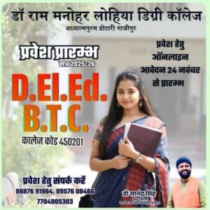 गाजीपुर। डा. राम मनोहर लोहिया डिग्री कालेज अध्यात्मपुरम् ढोटारी गाजीपुर में डीएलएड बीटीसी कालेज कोड 450201 में प्रवेश प्रक्रिया प्रारंभ हो गयी है। यह जानकारी सत्यदेव ग्रुप आफ कालेजेज के प्रबंध निदेशक डा. सानंद सिंह ने पूर्वांचल न्यूज डाट काम को दी है। उन्होने बताया कि डा. राम मनोहर लोहिया डिग्री कालेज ढोटारी में प्रवेश के लिए 24 नवंबर से ऑनलाइन आवेदन शुरु हो गया है। अधिक जानकारी के लिए मोबाइल नम्बर 8887691984, 8957608466, 7704905303 पर संपर्क करें।