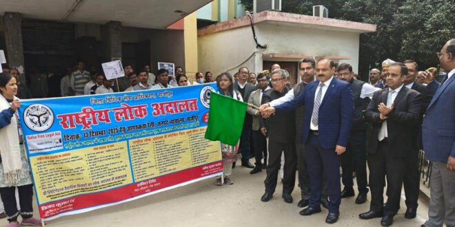 गाजीपुर। आगामी राष्ट्रीय लोक अदालत दिनांक 13 दिसंबर 2025 के व्यापक प्रचार-प्रसार हेतु जनपद न्यायालय गाज़ीपुर द्वारा एक जागरूकता रैली को जनपद न्यायाधीश द्वारा हरी झंडी दिखाकर जनपद न्यायालय के गेट सं0-01 से रवाना किया गया। इस अवसर पर जिला जज धर्मेन्द्र कुमार पाण्डेय, अपर जिला सत्र न्यायाधीश/सचिव जिला विधिक सेवा प्राधिकरण गाजीपुर, विजय कुमार व समस्त न्यायिक अधिकारीगण, अधिवक्ता, पैरा लीगल वॉलंटियर्स, पुलिसकर्मी, न्यायालय कर्मी तथा अन्य लोग उपस्थित हुए। रैली के द्वारा आमजनमा को राष्ट्रीय लोक अदालत के बारे में जागरूक किया गया सबके लिए न्याय चले, निर्धन से मिलने। लोक अदालत का है नारा ना कोई चिंता, ना कोई हारा। जिला विधिक सेवा प्राधिकरण का उद्देश्य आम जनता को सरल, सुलभ और निःशुल्क न्याय उपलब्ध कराए।