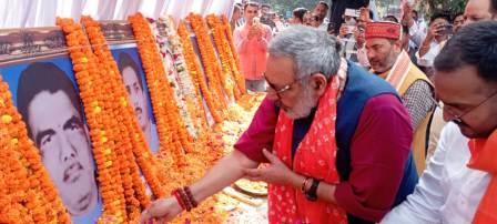 गाजीपुर। भाजपा के पूर्व विधायक स्वर्गीय कृष्णानंद राय एवं उनके साथियों के शहादत दिवस के अवसर पर शनिवार को मुख्यमंत्री बृजेश पाठक केंद्रीय मंत्री गिरिराज सिंह सहित उत्तर प्रदेश बिहार सहित अनेक जगहों से आए भाजपा नेताओं शहीद पार्क मोहम्मदाबाद में शाहिद विधायक कृष्णानंद राय एवं उनके साथ शाहिद स्वर्गीय श्यामाशंकर राय , रमेश नारायण राय, अखिलेश राय , निर्भय नारायण उपाध्याय ,शेषनाथ पटेल मुन्ना यादव के तैल चित्र पर पुष्पांजलि अर्पित कर श्रद्धा सुमन अर्पित किया। शहादत दिवस के कार्यक्रम को संबोधित करते हुए केंद्रीय मंत्री गिरिराज सिंह ने कहा कि स्वर्गीय कृष्णानंद राय पीयूष राय के पिता एवं विधायक अलका राय के पति ही नहीं थे बल्कि वे मोहम्मदाबाद गाजीपुर पूर्वांचल ही नहीं बिहार सहित पूरे उत्तर भारत के हिंदुओं के आवाज थे। उन्होंने मुख्तार अंसारी एवं अफजाल अंसारी पर निशाना चाहते हुए कहा कि यह परिवार कभी मसीहा नहीं हो सकता यह हमेशा से लुटेरा था और लुटेरा ही रहेगा उन्होंने हिंदुओं से एक होने की अपील करते हुए कहा कि अब समय आ गया है कि प्रभु श्री राम के तीर धनुष वाले मूर्ति का पूजा करें वही सुदर्शन चक्रधारी कृष्ण की आराधना करना प्रारंभ कर दे उन्होंने बिहार चुनाव की चर्चा करते हुए कहा कि बिहार में एक भी मुस्लिम भाजपा को वोट नहीं दिया। उत्तर प्रदेश के उपमुख्यमंत्री बृजेश पाठक ने कहा कि स्वर्ग कृष्णानंद राय मोहम्मदाबाद विधानसभा का चुनाव लड़के जनपद ही नहीं बल्कि प्रदेश की नामी गुंडे माफिया को चुनौती देने का काम किया था क्योंकि उसे समय मोहम्मदाबाद ही नहीं पूरा प्रदेश आतंक का पर्याय बन चुका था उन्होंने कहा कि कृष्णानंद की शहादत व्यर्थ नहीं गई क्योंकि आज क्योंकि आज गाजीपुर ही नहीं पूरे प्रदेश से गुंडे माफियाओं का सफाया हो चुका है मोहम्मदाबाद ही नहीं गाजीपुर का एक-एक व्यक्ति के लिए हमारा दरवाजा हमेशा खुला रहेगा इस मौके पर उन्होंने प्रदेश सरकार के द्वारा किए गए विकास कार्यों का भी उल्लेख किया शहीद स्वर्गीय विधायक कृष्णानंद राय की पत्नी पूर्व विधायक अलका राय ने कहा कि लगातार 20 वर्षों से स्वर्गीय कृष्णानंद राय को चाहने वाले लोगों को इकट्ठा देखकर मैं भावुक हो जाती हू। श्रद्धांजलि सभा को पूर्व मंत्री उपेंद्र तिवारी आनंद स्वरूप शुक्ला राज्यसभा सांसद नीरज शेखर संगीता बलवंत पूर्व विधायक सुरेंद्र सिंह अध्यक्ष सपना सिंह पारस राय अभिनव सिन्हा, जिला अध्यक्ष ओम प्रकाश राय अभिनव सिंह बीरेंद्र राय सानंद सिंह आनंद राय मुन्ना पीयूष राय राजेश बागी अरुण राय बबलू राय अध्यक्षता कैप्टन अनिरुद्ध राय एवं संचालन शशांक शेखर राय ने किया। दूसरी तरफ अखिल भारतीय पठान महासभा के प्रदेश महामंत्री हैदर 