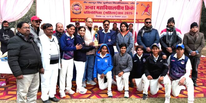 गाजीपुर। स्वामी सहजानंद स्नातकोत्तर महाविद्यालय गाजीपुर में अंतर महाविद्यालयीय महिला क्रिकेट प्रतियोगिता सत्र 2025 26 का आयोजन हुआ, जिसमे विजेता सूर्यबली महाविद्यालय जौनपुर, उप विजेता पांचू राम महाविद्यालय जौनपुर और तीसरे स्थान पर स्वामी सहजानंद स्नातकोत्तर महाविद्यालय गाजीपुर की टीम हुई, दिनांक 18 दिसंबर को सेमीफाइनल मैच में पहला सेमी फाइनल मैच स्वामी सहजानंद स्नातकोत्तर महाविद्यालय गाजीपुर और सूर्यबली महाविद्यालय के बीच हुआ पहले बल्लेबाजी करते हुए सूर्यबली महाविद्यालय की टीम ने 125 रन बनाई, सहजानंद की टीम 118 रन बना कर आला आउट हो गई। दूसरा मैच मडियाहूं पीजी कॉलेज जौनपुर और पांचू राम महाविद्यालय जौनपुर के बीच खेला गया जिसने मडियाहूं पी जी कालेज मात्र 73 रन बना के आल आउट हो गई जवाब में पांचू राम महा विद्यालय जौनपुर ने 2 विकेट खो कर 8 विकेट से मैच जीत लिया। कल का पहला स्वामी सहजानंद स्नातकोत्तर महाविद्यालय गाजीपुर और मडियाहूं पीजी कॉलेज जौनपुर के बीच मैच तीसरे स्थान के लिए खेला गया जिसमें स्वामी सहजानंद स्नातकोत्तर महाविद्यालय की टीम विजई हुई। फाइनल मैच पांचू राम महाविद्यालय जौनपुर और सूर्यबली महाविद्यालय जौनपुर के बीच खेला गया। इसी प्रतियोगित के माध्यम से वीर बहादुर सिंह पूर्वांचल विश्वविद्यालय की 14 सदस्यीय महिला क्रिकेट टीम का चयन होना है, मुख्य चयनकर्ता और पर्यवेक्षक के रूप में अलका सिंह जी पूरे प्रतियोगिता के दौरान मौजूद रही, फाइनल प्रतियोगिता के मुख्य अतिथि संजीव सिंह (बंटी) जो उत्तर प्रदेश यू पी टी २० गवर्निंग कौंसिल के सदस्य है। प्रतियोगिता में अंपायर स्मृति राय अभिनव और मैच रेफरी रंजन सिंह थे, प्रतियोगिता के दौरान महाविद्यालय के प्राचार्य प्रो (डा) वी के राय के साथ डा विलोक सिंह, डॉ रामधारी राम, डॉ अवधेश पांडे, डॉ सतीश राय, प्रवीण राय, समीर राय मौजूद थे।