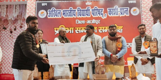 ग़ाज़ीपुर। अखिल भारतीय विद्यार्थी परिषद (अभाविप) ग़ाज़ीपुर के तत्वावधान में रॉयल पैलेस में प्रतिभा सम्मान समारोह का भव्य आयोजन किया गया। कार्यक्रम में राष्ट्रीय स्वयंसेवक संघ के प्रांत प्रचारक रमेश जी मुख्य अतिथि के रूप में उपस्थित रहे। विशिष्ट अतिथियों के रूप में सपना सिंह जिलापंचायत अध्यक्ष, काशी प्रांत के प्रांत संगठन मंत्री अभिलाष जी एवं जिला संयोजक बृजेश जी मौजूद रहे। कार्यक्रम की अध्यक्षता पारस नाथ राय की गरिमामयी उपस्थिति रही। कार्यक्रम में जिला संघचालक जयप्रकाश जी जिला प्रचारक प्रभात जी नगर प्रचारक विक्रम जी की विशेष रूप से उपस्थित रहे। कार्यक्रम का शुभारंभ दीपप्रज्वलन के साथ हुआ। इसके उपरांत प्रान्त संगठन मंत्री अभिलाष जी ने प्रास्ताविकी भाषण देते हुए आयोजन के उद्देश्य पर प्रकाश डाला। मुख्य अतिथि रमेश जी ने संघ के पंच प्राण कैसे आवश्यक रूप से विद्यार्थी जीवन मे लाया जाए इसपर प्रकाश डाला। इस अवसर पर विभिन्न विद्यालयों के लगभग 600 मेधावी विद्यार्थियों को मंच से सम्मानित किया गया, जिससे विद्यार्थियों में उत्साह और प्रेरणा का वातावरण देखने को मिला। कार्यक्रम का संचालन एवं धन्यवाद ज्ञापन जिला संयोजक बृजेश जी द्वारा किया गया। कार्यक्रम के अध्यक्ष पारसनाथ राय ने अपने संबोधन में कहा कि “प्रतिभा किसी एक वर्ग की बपौती नहीं होती, आवश्यकता केवल उसे पहचानने और उचित मंच प्रदान करने की होती है। अखिल भारतीय विद्यार्थी परिषद द्वारा किया जा रहा यह प्रयास विद्यार्थियों को आगे बढ़ने की प्रेरणा देता है। समाज के निर्माण में विद्यार्थियों की भूमिका सबसे महत्वपूर्ण है और ऐसे आयोजन उन्हें राष्ट्र निर्माण के लिए तैयार करते हैं। उन्होंने यह भी कहा कि शिक्षा के साथ संस्कारों का समन्वय ही एक सशक्त समाज की नींव रखता है और अभाविप वर्षों से इसी दिशा में कार्य कर रही है। कार्यक्रम में कामदेश्वर सिंह(पूर्व प्रदेश सहमंत्री),बृजेश सिंह, शिवांशु सिंह,प्रभात सिंह,अंकिता यादव,रोशन यादव,काजल कुशवाहा, अमृता राय,नीतीश दूबे,अंकित जायसवाल,विपुल आदि कार्यकर्ता उपस्थित रहे। सहित बड़ी संख्या में अभाविप कार्यकर्ता उपस्थित रहे। कार्यक्रम का समापन राष्ट्र निर्माण के संकल्प और विद्यार्थियों के उज्ज्वल भविष्य की कामना के साथ किया गया।