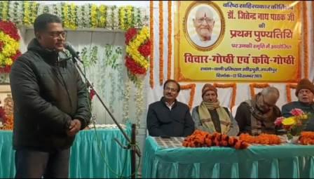 गाजीपुर। डॉक्टर जितेंद्र पाठक की प्रथम पुण्यतिथि उनके निवास स्थान रवींद्र पुरी गाजीपुर में मनाई गईl इस अवसर पर बोलते हुए विशिष्ट अतिथि पीजी कॉलेज गाजीपुर के मनोविज्ञान विभाग के पूर्व विभागाध्यक्ष अध्यक्ष डॉ अंबिका पांडे ने कहा कि पाठक जी गाजीपुर के साहित्य आकाश के सूर्य थे। उन्होंने पाठक जी की कविता ‘सीता विषाद ‘की चर्चा की ।इसके पश्चात पीजी कॉलेज गाजीपुर के हिंदी विभाग के विभागाध्यक्ष विनय कुमार दुबे ने डॉक्टर जितेंद्र पाठक से जुड़े अपने संस्मरण सुनाए और बताया कि पाठक जी के साहित्य के ऊपर वो एक शोध कार्य भी करवा रहे हैं।.पी.जी. कॉलेज गाजीपुर के संस्कृत विभाग के विभागाध्यक्ष डॉ समरेंद्र मिश्रा ने कहा कि डॉक्टर जितेंद्र नाथ पाठक ने स्त्री के चरित्र को नई ऊंचाई दीl’ शाम ‘कविता के माध्यम से उन्होंने अद्भुत प्रकृति चित्रण किया lडॉ संतोष कुमार तिवारी ने कहा कि’ कुछ लोग हैं जो वक्त के सांचे में ढल गए ।कुछ लोग हैं जो वक्त के सांचे बदल गए ।।डॉक्टर जितेंद्र पाठक ,डॉक्टर पी एन सिंह ,डॉक्टर विवेकी राय, डॉक्टर कुबेरनाथ राय ,डॉ उमाशंकर तिवारी डॉक्टर भोलानाथ तिवारी ऐसे ही साहित्यकार थे ,जिन्होंने गाजीपुर की साहित्य की धारा के सांचे को बदला। इस अवसर पर गणित विभाग के पूर्व विभाग अध्यक्ष डॉ रमाशंकर सिंह जी ने कहा कि ‘अतीतजीवी और काल ‘रचना डॉक्टर जितेंद्रनाथ पाठक की कालजयी रचना है और इस रचना के लिए उन्हें ज्ञानपीठ पुरस्कार मिलना चाहिए था। पी.जी .कॉलेज गाजीपुर के हिंदी विभाग के पूर्व विभागाध्यक्ष डॉ दिनेश सिंह जी ने पाठक जी को एक श्रेष्ठ कवि, कहानीकार ,आलोचक और निबंधकार बताया ।पाठक जी की पुत्री डॉक्टर कल्पना पांडे ने बिंबों और प्रतीकों से भरी हुई एक कविता के माध्यम से अपने पिता को याद किया ।डॉक्टर युधिष्ठिर तिवारी जो कि पीजी कॉलेज संस्कृत विभाग के पूर्व विभाग अध्यक्ष थे ,उन्होंने कहा कि पाठक जी की कविता ‘अतीतजीवी और काल’का काशी हिंदू विश्वविद्यालय में उस समय के महान आचार्य श्री रेव पांडे ने संस्कृत में पद्य अनुवाद किया था। कार्यक्रम की अध्यक्षता करते हुए विद्वान साहित्यकार मांधाता राय ने कहा कि पाठक जी एक महान साहित्यकार थे और उन्होंने गाजीपुर में एक साहित्यिक पीढ़ी का निर्माण करने में अभूतपूर्व योगदान किया ।इस अवसर पर एक काव्य गोष्ठी का अभियान आयोजन हुआ जिसकी शुरुआत वीर रस के कवि दिनेश चंद्र शर्मा ने पाठक जी को याद करते हुए अपनी एक कविता सुनाई ‘”वर्षों बीत गए आपको गंगा में समाहित हुए। फिर भी नयन है आपकी आत्मा के लिए “युवा गजलकार गोपाल गौरव ने सुनाया “फंस गए मजधार आखिर किस लिए ?हाथ में पतवार आखिर किस लिए? तू मोहब्बत का पुजारी है अगर? हाथ में तलवार आखिर किस लिए?” हरिशंकर पांडे ने 