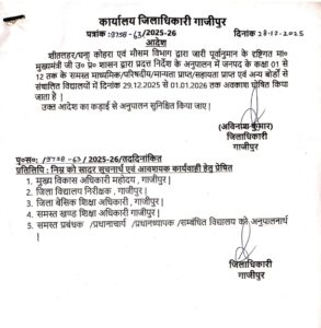 गाजीपुर। जिलाधिकारी अविनाश कुमार ने बताया कि कड़ाके की ठंड, शीतलहर और घने कोहरे को देखते हुए जनपद के कक्षा-एक से लेकर 12 तक के समस्त माध्यमिक, परिषदीय, मान्यता प्राप्त एवं अन्य बोर्ड से संचालित विद्यालय 29 दिसंबर से 1 जनवरी तक बंद रहेंगे। आदेश नहीं मानने वाले विद्यालयों के खिलाफ कड़ी कार्रवाई होगी।
