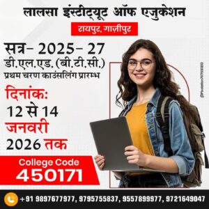 गाजीपुर। लालसा इंस्टीट्यूट आफ एजुकेशन रायपुर गाजीपुर में डीएलएड बीटीसी प्रथम चरण की काउंसलिंग शुरु हो गयी है। इस कालेज का कोड 450171 है। यह जानकारी कालेज के प्रबंध निदेशक ई. अजय यादव ने दी है। उन्होने बताया कि जिन अभ्यर्थियों ने अपना पंजीकरण डीएलएड प्रवेश के लिए कराया है उनका प्रथम चरण में 12 जनवरी से 14 जनवरी तक एक से 20 हजार रैंक तक काउंसलिंग होनी है। दिनांक 15 से 18 जनवरी से 20001 से 70000 रैंक के अभ्यर्थियों की काउंसलिंग होगी। 19 से 22 जनवरी तक 70001 से 124230 रैंक तक के अभ्यर्थियों की काउंसलिंग होनी है। द्वितीय चरण में 5 से 12 फरवरी तक छूटे हुए अभ्यर्थियों की काउंसलिंग करायी जायेगी। डीएलएड बीटीसी के इच्छुक अभ्यर्थी लालसा इंस्टीट्यूट रायपुर गाजीपुर में पहुंचकर प्रवेश सुनिश्चित करायें। अधिक जानकारी के लिए मोबाइल नम्बर 9897677977, 9795759837, 9557899977, 9721649047 पर संपर्क करें।