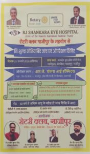 गाजीपुर। सत्यदेव हॉस्पिटल गाज़ीपुर में दिनांक 25 जनवरी 2026 को निःशुल्क मोतियाबिंद के ऑपरेशन का शिविर लग रहा है। जिसमें वाराणसी के बड़े हॉस्पिटल RJ शंकरा से आयी डॉक्टरों की टीम के द्वारा परीक्षण होगा व आवश्यकता पड़ने पर ऑपरेशन की व्यवस्था की जानी है। इस शिविर में 50 वर्ष की आयु से ऊपर के लोगों को जिन्हें मोतियाबिंद है, उनका ऑपरेशन कराया जाएगा। ऑपरेशन के लिए पूर्व में ही 22 जनवरी तक रजिस्ट्रेशन करना है ,जिसमें दो पासपोर्ट साइज फोटो और आधार कार्ड और मोबाइल नंबर लगेगा। रजिस्ट्रेशन भी बिल्कुल निशुल्क है। इच्छुक लोग सत्यदेव हॉस्पिटल में पहुंचकर अपना पंजीकरण कर सकते हैं।