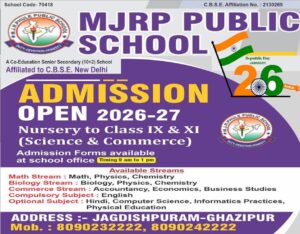 गाजीपुर। सीबीएसई बोर्ड से मान्यता प्राप्त एमजेआरपी पब्लिक स्कूल जगदीशपुरम गाजीपुर में सत्र 2026-27 के लिए प्रवेश प्रारंभ हो गया है। एमजेआरपी पब्लिक स्कूल के प्रबंध निदेशक राजेश कुशवाहा ने बताया कि नर्सरी से कक्षा- 9 व 11 में साइंस, और कामर्स में प्रवेश प्रारंभ हो गया है। हमारे यहां गणित वर्ग में मैथ, फिजिक्स, कमेस्ट्री, बायोलॉजी ग्रुप में बायोलाजी, फिजिक्स, कमेस्ट्री, कामर्स ग्रुप में एकाउंटेंसी, एकोनामिक्स, बिजनेस स्टडी, अनिवार्य सब्जेक्ट अंग्रेजी है। वैकल्पिक विषय में हिंदी, कम्प्यूटर साइंस, इंफार्मेाटिक्स और सोशल एजुकेशन है। अधिक जानकारी के लिए मोबाइल नम्बर 7007102093, 8090232222, 8090242222 पर संपर्क कर सकते हैं।