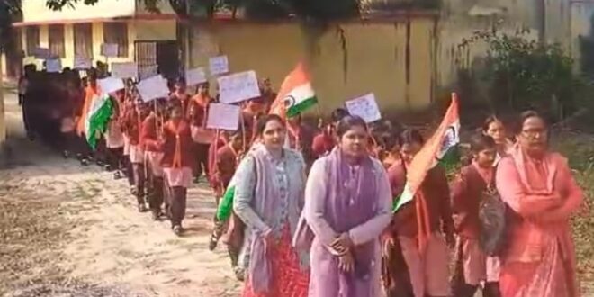 गाजीपुर। 77वें गणतत्र दिवस के अवसर पर कस्तूरबा गांधी आवासीय बालिका विद्यालय बिरनों के तत्वाधान में विशेष शिक्षा जागरूकता अभियान के तहत बालिकाओ की प्रातः 9 बजे रैली निकालकर लोगो को जागरूक किया गया। विद्यालय में 26 जनवरी गणतंत्र दिवस पर ध्वाजारोहण कर रैली का आयोजन किया गया। यह रैली राष्ट्रीय धून के साथ बच्चो के नारो से गुंजयमान रहा जो विद्यालय से बिरनो बाजार व जयरामपुर चटटी तक प्रभात फेरी के माध्यम से किया गया। इस रैली के आयोजक वार्डेन ममता व अध्यापिका सुमन ने बताया कि विद्यालय के माध्यम से आउट आफ स्कूल बालिकाओं के सुरक्षित संवेदनशील एंव अनुकूल शैक्षिक वातावरण, कक्षा 12 तक निरंतर निःशुल्क शिक्षा को बढ़ावा, बालिकाओ के शैक्षिक सशक्तिकरण के लिए विशेष योजनाएं एव सहायता, रानी लक्ष्मीबाई आत्मरक्षा प्रशिक्षण , मीना मंच एवं जीवन कौशल कार्यक्रमो के माध्यम से आत्मविश्वास, सुरक्षा बोधा एवं नेतृत्व क्षमता का विकास, अभिभावको एवं समुदाय सहभागिता के माध्यम से बालिकाा शिक्षा सुदृढीकरण, समाज मे व्याप्त कुप्रथाओ के विरूद्ध मिशन शक्ति के अन्तर्गत निरन्तर जन जागरूकता अभियान का संचालन कर बालिकाओ को शिक्षित व मजबूत बनाया जाता है। दिव्यांगो मे क्षमता का विकास समेकित शिक्षा के माध्यम से किया जाता है। बालिकाओं को अनिवार्य शिक्षा आरटीई के अन्तर्गत बच्चो को निःशुल्क शिक्षा, पाठयपुस्तके, कार्य पुस्तिकाएं एंव अध्ययन सामाग्री उपलब्ध करायी जाती है। बच्चो को डिजिटल एवं आईसीटी आधारित संसाधन तथा शिक्षण सामाग्री के माध्यम से शिक्षित किया जाता है। इस अवसर पर सीमा, अशोक, कमलेश सहित सभी स्टाफ उपस्थित रहे।