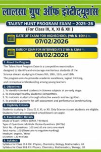 गाजीपुर। लालसा ग्रुप आफ इंस्टीट्यूशंस रायपुर बहरियाबाद के तत्वावधान में टैलेंट हंट प्रोग्राम परीक्षा 2025-26 का आयोजन 7 और 8 फरवरी को आयोजित होगा। यह जानकारी ग्रुप के प्रबंध निदेशक इंजी. अजय यादव ने पूर्वांचल न्यूज डाट काम को दी। उन्होने बताया कि प्रतिभा खोज कार्यक्रम परीक्षा- 2025-26 कक्षा 9, 10, 11 और 12 के लिए आयोजित की जा रही है। हाई स्कूल (9वीं और 10वीं) के लिए परीक्षा तिथि सात फरवरी 2026 और इंटरमीडिएट (11वीं और 12वीं) के लिए परीक्षा तिथि 8 फरवरी होगा। उन्होने बताया कि प्रतिभा खोज कार्यक्रम परीक्षा एक प्रतियोगी परीक्षा है जिसका उद्देश्य कक्षा 9वीं, 10वीं, 11वीं और 12वीं में पढ़ रहे विज्ञान स्ट्रीम के मेधावी छात्रों की पहचान करना और उन्हें प्रोत्साहित करना है। इस कार्यक्रम का उद्देश्य युवा शिक्षार्थियों में शैक्षणिक उत्कृष्टता, तार्किक सोच और वैचारिक समझ को बढ़ावा देना है। विज्ञान विषयों में प्रतिभावान छात्रों की प्रारंभिक अवस्था में पहचान करना, स्वस्थ शैक्षणिक प्रतिस्पर्धा को प्रोत्साहित करना, आकर्षक पुरस्कारों और सम्मानों के माध्यम से छात्रों को प्रेरित करना, स्व-मूल्यांकन और प्रदर्शन तुलना के लिए एक मंच प्रदान करना। इंजी. अजय यादव ने बताया कि कक्षा 9, 10, 11 या 12 में अध्ययनरत छात्र। केवल विज्ञान स्ट्रीम के छात्र ही पात्र हैं। किसी भी मान्यता प्राप्त विद्यालय/बोर्ड के छात्र आवेदन कर सकते हैं। उन्होने बताया कि परीक्षा का तरीका: ऑफलाइन (ओएमआर / लिखित), प्रश्नों का प्रकार: बहुविकल्पीय प्रश्न (एमसीक्यू), प्रश्नों की कुल संख्या: 100 और सभी प्रश्न एक अंक के हैं।, कुल अंक: 100 (कोई नकारात्मक अंकन नहीं है), माध्यम: अंग्रेजी / हिंदी, अवधि: 120 मिनट की होगी। उन्होने बताया कि कक्षा IX और XX के लिए पाठ्यक्रम: भौतिक विज्ञान, रसायन विज्ञान, जीव विज्ञान, गणित, सामान्य ज्ञान, कक्षा XI और XII के लिए पाठ्यक्रम: भौतिक विज्ञान, रसायन विज्ञान, गणित/जीव विज्ञान, सामान्य ज्ञान होगी। इंजी. अजय यादव ने बताया कि प्रतियोगिता में प्रथम स्थान के विजेता को लैपटॉप, द्वितीय टैबलेट, तृतीय को साइकिल और इस अन्य विजेताओं को स्मार्ट वॉच मिलेगा। इसके अलावा सभी पुरस्कार विजेताओं को उत्कृष्टता प्रमाण पत्र प्राप्त होंगे। अधिक जानकारी के लिए ललसा ग्रुप ऑफ इंस्टीट्यूशंस पता: रायपुर गाजीपुर के मोबाइल नम्बर 9897677977, 7208711250 व ईमेल: vipgzp2019@gmail.com पर संपर्क करें।