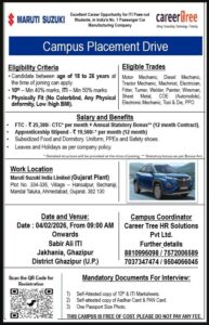 गाजीपुर। साबिर अली आई टी आई जखनिया में युवाओं के लिये रोज़गार का सुनहरा अवसर दे रहा है। भारत की नंबर-1 पैसेंजर कार निर्माण कंपनी मारुति सुजुकी इंडिया लिमिटेड द्वारा आईटीआई पास-आउट छात्रों के लिए एक सुनहरा अवसर प्रदान किया जा रहा है। इसी क्रम में कैंपस प्लेसमेंट ड्राइव का आयोजन किया जा रहा है। यह कैंपस प्लेसमेंट ड्राइव 04 फरवरी 2026 (बुधवार) को प्रातः 09:00 बजे से आयोजित होगी। आयोजन स्थल साबिर अली आईटीआई, जखनिया, जनपद गाजीपुर (उत्तर प्रदेश) निर्धारित किया गया है। इस प्लेसमेंट ड्राइव में 18 से 26 वर्ष आयु वर्ग के वे अभ्यर्थी भाग ले सकते हैं जिन्होंने 10वीं में न्यूनतम 40 प्रतिशत तथा आईटीआई में न्यूनतम 50 प्रतिशत अंक प्राप्त किए हों। अभ्यर्थियों का शारीरिक रूप से फिट होना अनिवार्य है। योग्य ट्रेड्स में मोटर मैकेनिक, डीजल मैकेनिक, ट्रैक्टर मैकेनिक, मशीनिस्ट, इलेक्ट्रीशियन, फिटर, टर्नर, वेल्डर, पेंटर, वायरमैन, शीट मेटल, ऑटोमोबाइल, इलेक्ट्रॉनिक मैकेनिक, टूल एंड डाई सहित अन्य संबंधित ट्रेड्स शामिल हैं। चयनित अभ्यर्थियों को FTC के अंतर्गत ₹25,300 प्रति माह (CTC) के साथ वार्षिक वैधानिक बोनस प्रदान किया जाएगा। इसके अतिरिक्त अप्रेंटिसशिप के दौरान ₹19,500 प्रति माह स्टाइपेंड दिया जाएगा। चयनित उम्मीदवारों को सब्सिडाइज्ड भोजन एवं डॉरमेट्री सुविधा, यूनिफॉर्म, पीपीई किट एवं सेफ्टी शूज़ जैसी सुविधाएं भी उपलब्ध कराई जाएंगी। अवकाश एवं छुट्टियां कंपनी की नीति के अनुसार होंगी। चयनित अभ्यर्थियों की कार्यस्थली मारुति सुजुकी इंडिया लिमिटेड का गुजरात प्लांट रहेगा। इंटरव्यू के समय अभ्यर्थियों को 10वीं एवं आईटीआई की स्व-प्रमाणित अंकतालिकाएं, आधार कार्ड, पैन कार्ड की प्रति तथा एक पासपोर्ट साइज फोटो साथ लाना अनिवार्य होगा। यह कैंपस प्लेसमेंट ड्राइव पूर्णतः निःशुल्क है। किसी भी प्रकार का शुल्क देय नहीं है। यह आयोजन युवाओं के लिए देश की प्रतिष्ठित ऑटोमोबाइल कंपनी में करियर बनाने का एक उत्कृष्ट अवसर है। इसकी जानकारी साबिर अली आईटीआई के निदेशक आमिर अली ने दिया।
