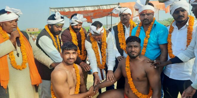 गाजीपुर।महाशिवरांत्री के अवसर पर बाबा चॊमुखनाथ धाम धुवार्जुन परिसर मे दूसरे दिन सोमवार को आयोजित विराट कुश्ती दंगल का उदघाटन ब्लाक प्रमुख प्रतिनिधि उपेन्द्रलाल यादव ने दोनो पहलवानों का हाथ मिलाकर किया।कुश्ती दंगल मे गोलू पहलवान अंधऊ व शम्भूपाल पहलवान मुङरभा के बीच कुश्ती आकर्षण का केन्द्र बिन्दु बना रहा जो बराबरी पर छूटी इसके अलावा सन्नी भुजाङी ने आन्नद अधऊं,कल्लू अंधऊ ने अनंत शेखपुर,इस्तियाक छपरा ने संदीप संकटमोचन,अरविन्द सिखङी ने मनीष करमपुर,आशू भितरी ने सॊरभ सिखङी,गोरख करमपुर ने गोविन्द कुर्बानसराय,सुनील हंसराजपुर ने शकील शेखपुर को परास्त कर बिजेता बने।अंकुर भुजाङी व जयदीप कोटिसा,जुगनू कोटिसा व हरिकेश अंधऊ,प्रिन्स करमपुर व विकास संकटमोचन,विशाल करमपुर व मयंक भुजाङी,उमा छपरा व राजबहादुर सतमेसरा,किशन शेखपुर व विशाल भुजाङी के बीच कुश्ती बराबरी पर छुटी। आयोजक समिति के अध्यक्ष वेचन राय ने अम्बिका पहलवान भितरी,पंकज राय ने रामजी पहलवान धुवार्जुन,सुधीर पाण्डेय ने बॆजनाथ पहलवान खुटवां,जुगनू ने सतीश पहलवान भितरी,मुकेश राम ने विरेन्द्र पहलवान खोजनपुर,दीलीप राम ने कॆलाश पहलवान चकियां को अंगवस्त्रम व माल्यापर्ण कर स्वागत किया।कुश्ती दंगल मे शिवशंकर राजभर,नमन राजभर,विपुल चॊहान,रोशन भारतीय,प्यारेलाल चॊहान का विशेष योगदान रहा।उदघोषक का कार्य सुधीर पाण्डेय व रेफरी का कार्य धीरज पहलवान धुवार्जुन ने किया।अंत मे बाबा चॊमुखनाथ धाम समिति धुवार्जुन के अध्यक्ष वेचन राय, पंकज राय व सुधीर पाण्डेय ने दो दिवसीय मेला व कुश्ती दंगल को सफल बनाने के लिए भितरी पुलिस चॊकी के इंचार्ज सॆदपुर के थानाध्यक्ष सहित सहयोगियों के प्रति आभार ब्यक्त किया।