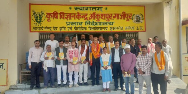 गाजीपुर। आचार्य नरेंद्र देव कृषि एवं प्रौद्योगिकी विश्वविद्यालय, कुमारगंज, अयोध्या द्वारा संचालित कृषि विज्ञान केंद्र आंकुशपुर के अध्यक्ष कृषि (सस्य विज्ञान) एवं वरिष्ठ वैज्ञानिक डॉ. जे.पी. सिंह के शनिवार को सेवानिवृत्त होने पर क्षेत्रीय किसानों ने तेज बहादुर सिंह की अध्यक्षता में कृषि विज्ञान केंद्र के सभाकक्ष में सम्मान समारोह आयोजित कर उन्हें भावभीनी विदाई दी।इस अवसर पर माध्यमिक शिक्षक संघ के पूर्व जिलाध्यक्ष शिव कुमार सिंह ने कहा कि डॉ. सिंह ने अपने कार्यकाल के दौरान किसानों को नवीन कृषि तकनीकों, उन्नत बीजों और वैज्ञानिक पद्धतियों की जानकारी देकर खेती को लाभकारी बनाने में महत्वपूर्ण भूमिका निभाई। उनकी सरलता, कार्यनिष्ठा और किसानों के प्रति समर्पण हमेशा स्मरणीय रहेगा।जिला मीडिया प्रभारी शशिकान्त शर्मा ने कहा कि डॉ. जे.पी. सिंह ने किसानों और कृषि वैज्ञानिकों के बीच मजबूत समन्वय स्थापित किया। उन्होंने समय-समय पर प्रशिक्षण, गोष्ठियों और खेत प्रदर्शन के माध्यम से किसानों को नई तकनीकों से जोड़ा, जिससे क्षेत्र की कृषि उत्पादकता में वृद्धि हुई। उनका व्यवहार और नेतृत्व क्षमता सभी के लिए प्रेरणादायक रही है।जिला मंत्री सुरेश बिंद ने कहा कि डॉ. सिंह का मार्गदर्शन किसानों के लिए प्रेरणास्रोत रहा है। उन्होंने खेती को वैज्ञानिक आधार देने के साथ-साथ किसानों को आत्मनिर्भर बनाने की दिशा में उल्लेखनीय कार्य किया। उनके योगदान को कभी भुलाया नहीं जा सकेगा।कार्यक्रम में कृषि वैज्ञानिक डा ए के सिंह, भाजपा मंडल अध्यक्ष काशी चौहान, गोपाल राय, अरविन्द सिंह, मुरली कुशवाहा,उदय प्रताप सिंह, ओमप्रकाश सिंह, आरती बिंद आदि किसानों एवं गणमान्य लोगों ने डॉ. सिंह को अंगवस्त्र ,स्मृति चिन्ह व पुष्प गुच्छ भेंट कर सम्मानित किया तथा उनके स्वस्थ एवं सुखद जीवन की कामना की। संचालन कृषि वैज्ञानिक डा दीपक प्रजापति ने किया।